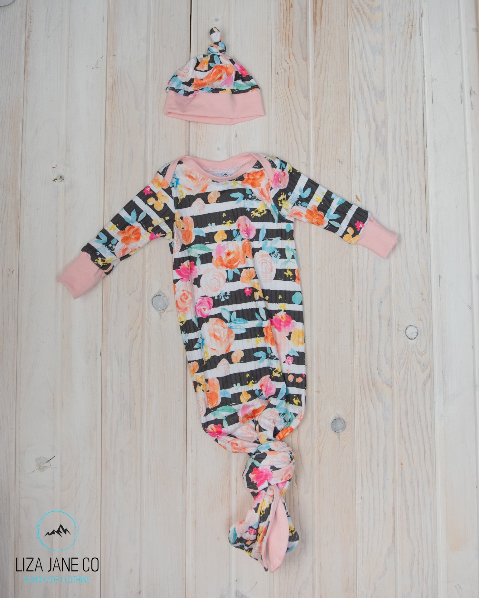 Newborn sleeper sack that ties on the bottom. This style features snaps along the shoulder for easy changing, as well as built in foldover mitts and a hat!