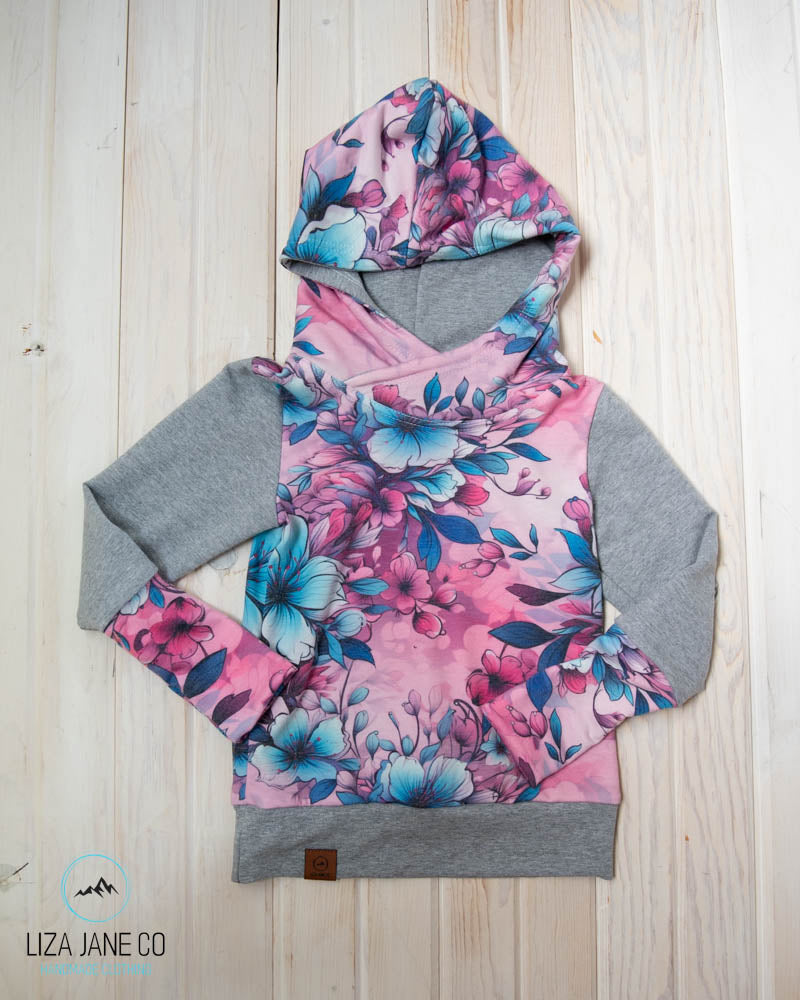 Grow with Me Hoodie | Pink/aqua Floral & Grey Sleeves