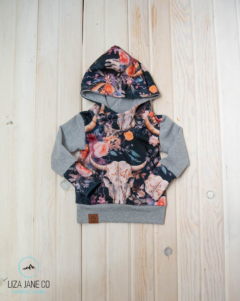Grow with Me Hoodie | Vibrant Floral skull on Navy & Grey Sleeves