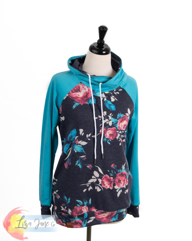 Women's Hoodie | Floral on blue and Aqua {Small}