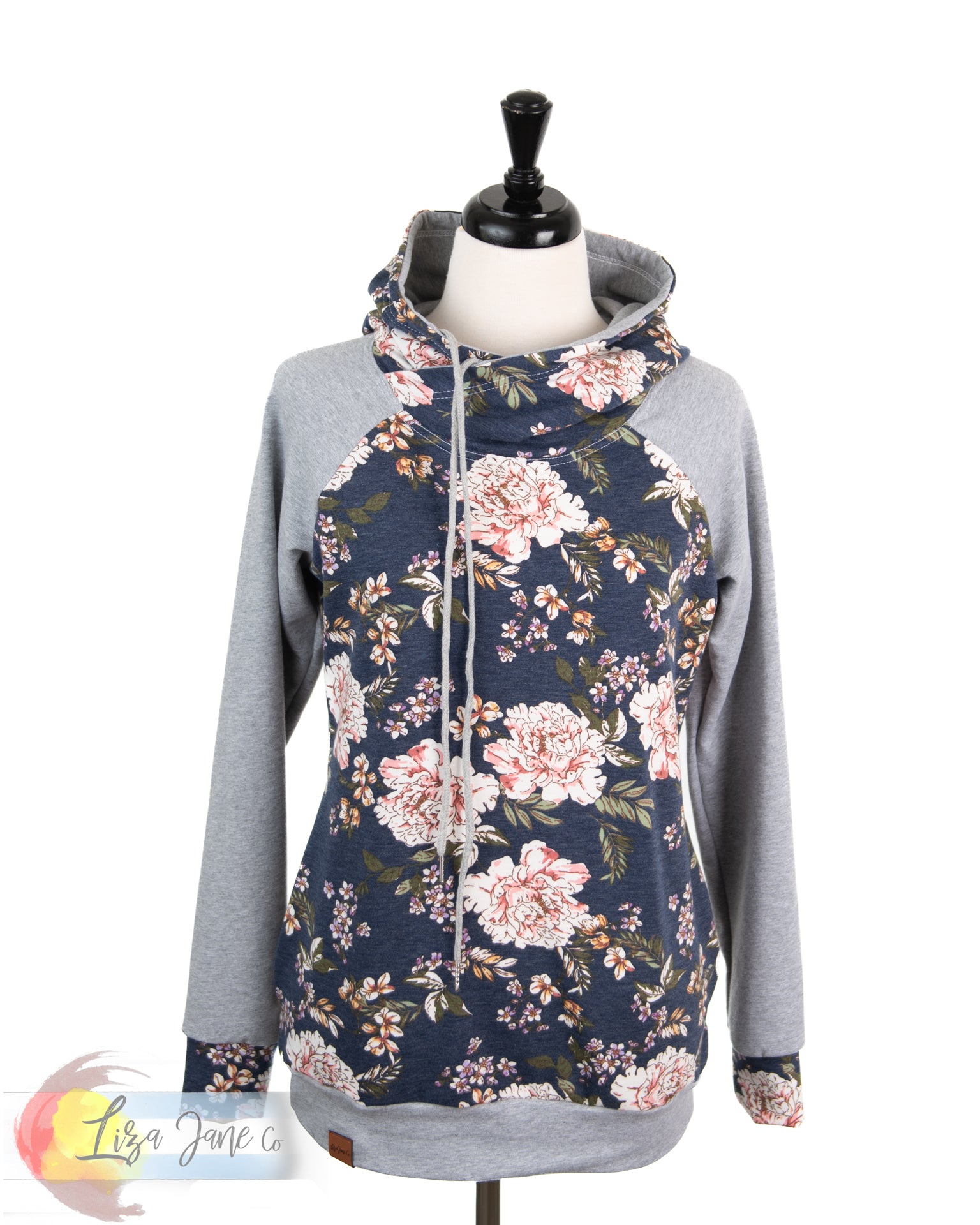 Women's Hoodie | Floral on Blue and Heather Grey {Small}