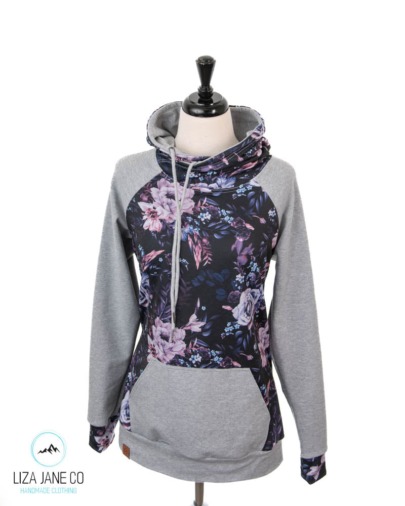 Women's Hoodie | Purple Floral on black and Grey on Sleeves {Made to Order}
