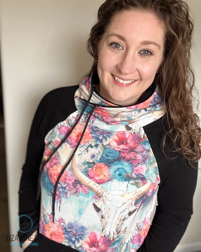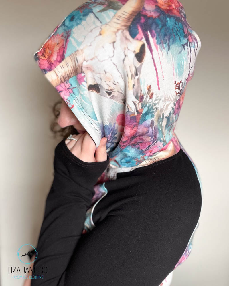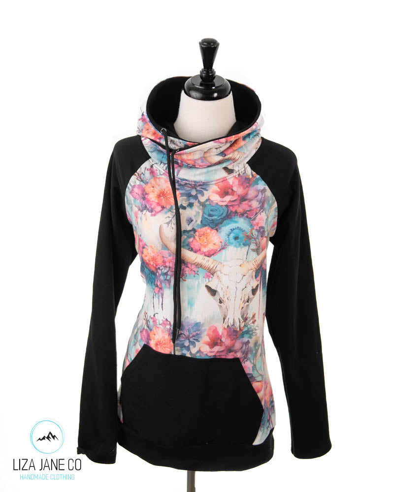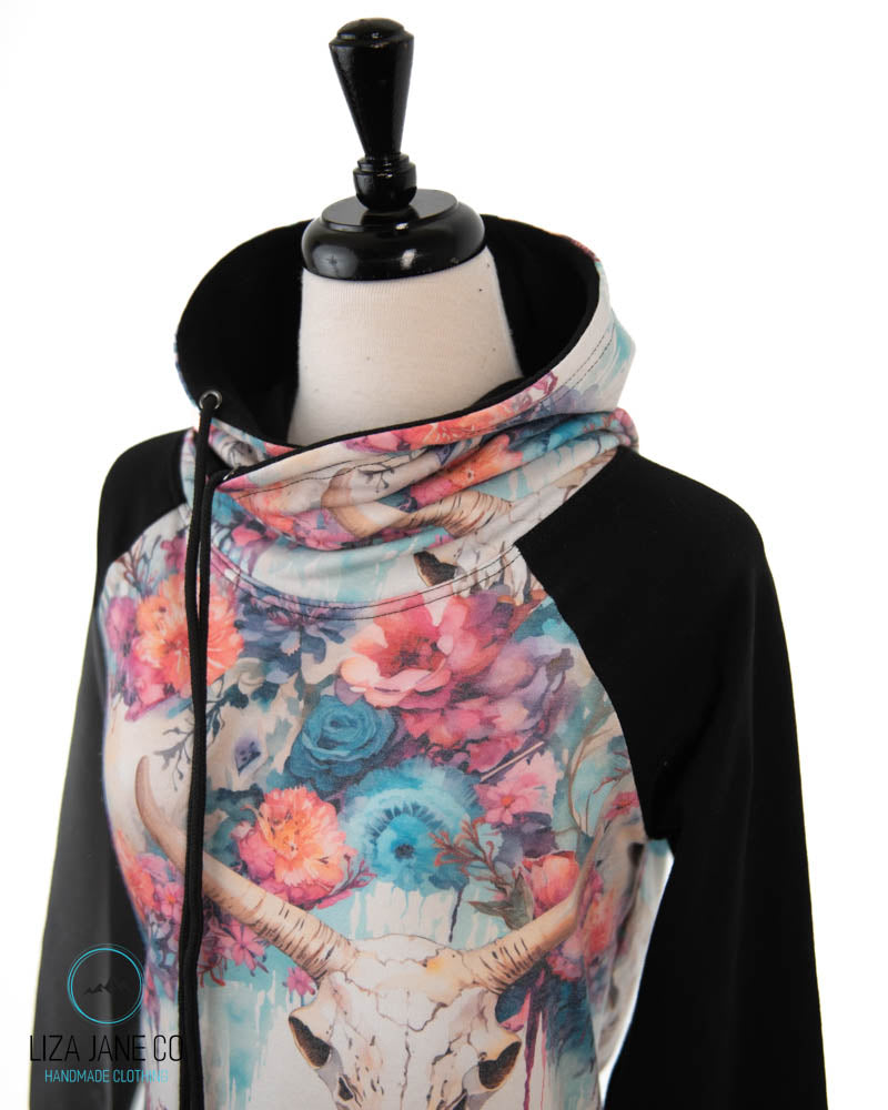 Women's Hoodie | Skull on bright dripping floral and black on Sleeves {Made to Order}