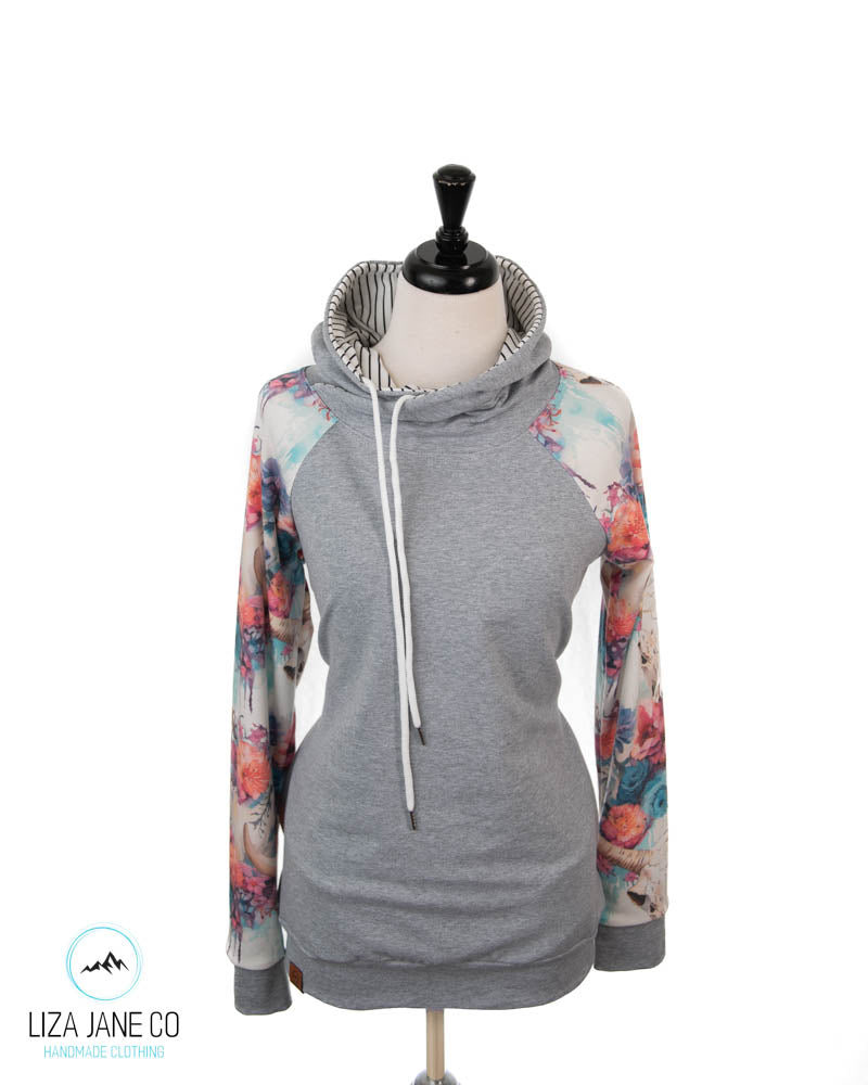 Women's Hoodie | Skull on bright dripping floral and Grey on Body {Large}