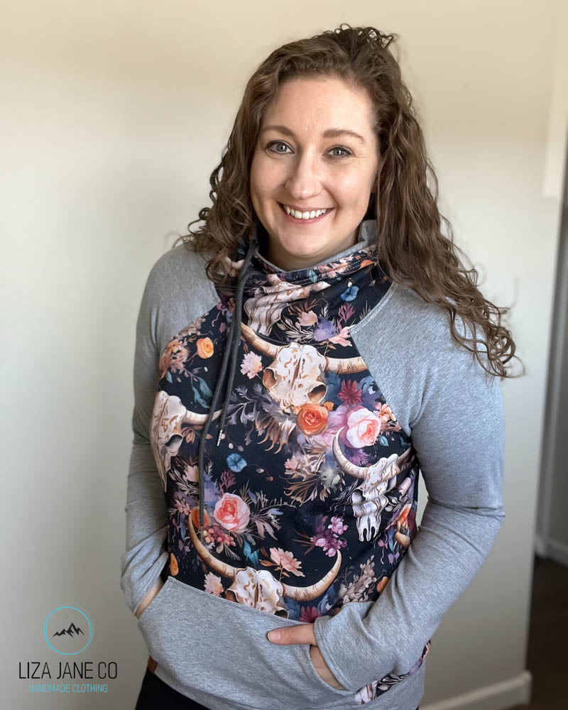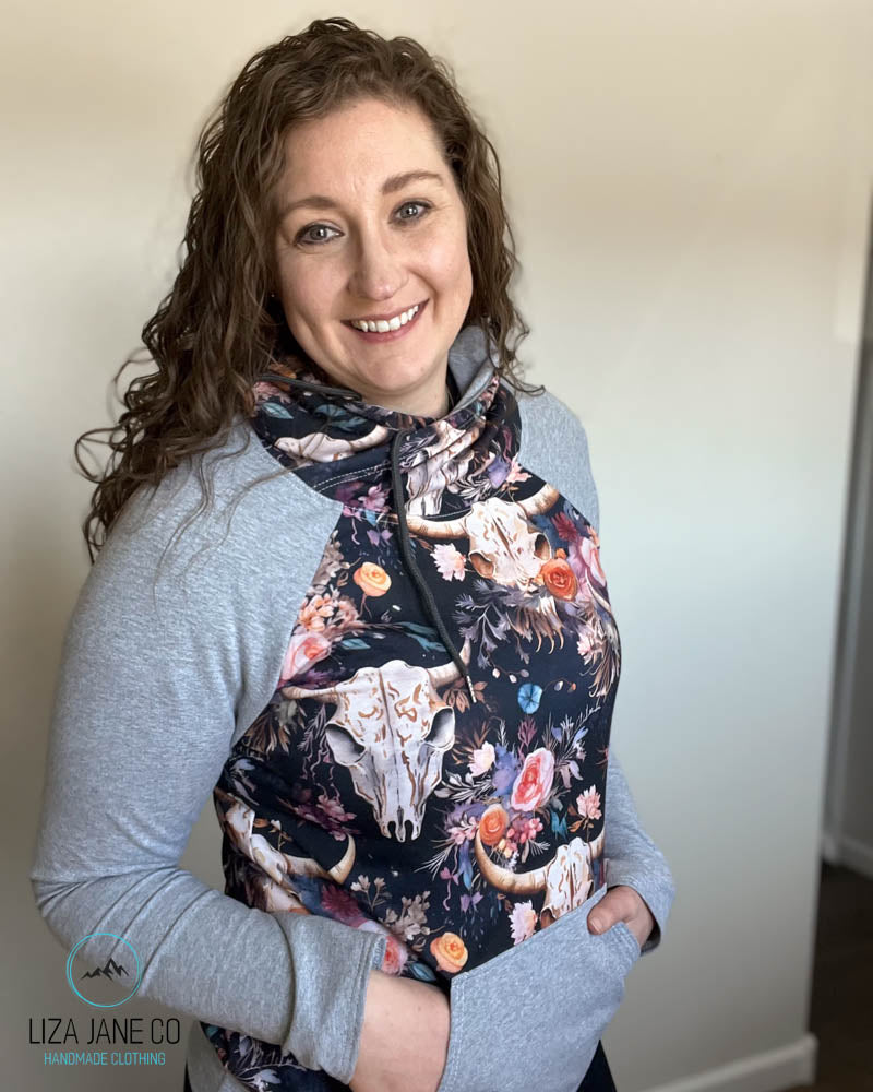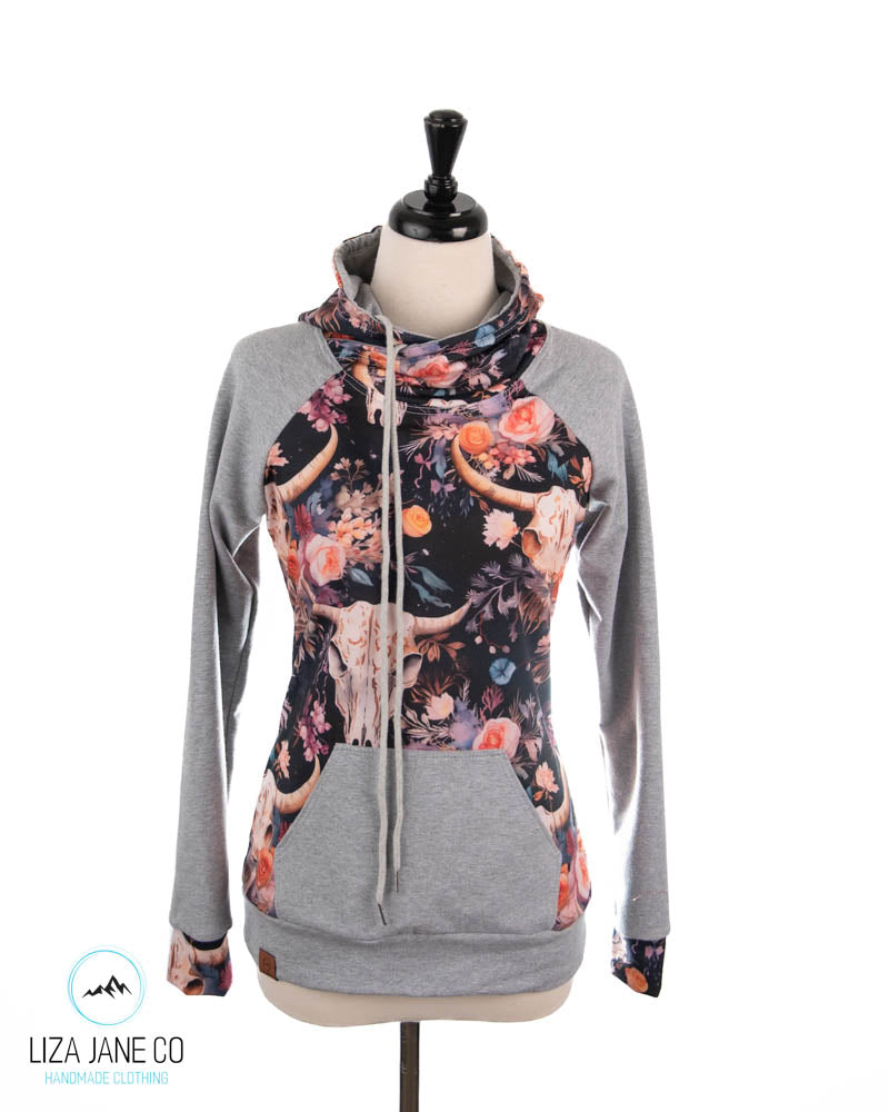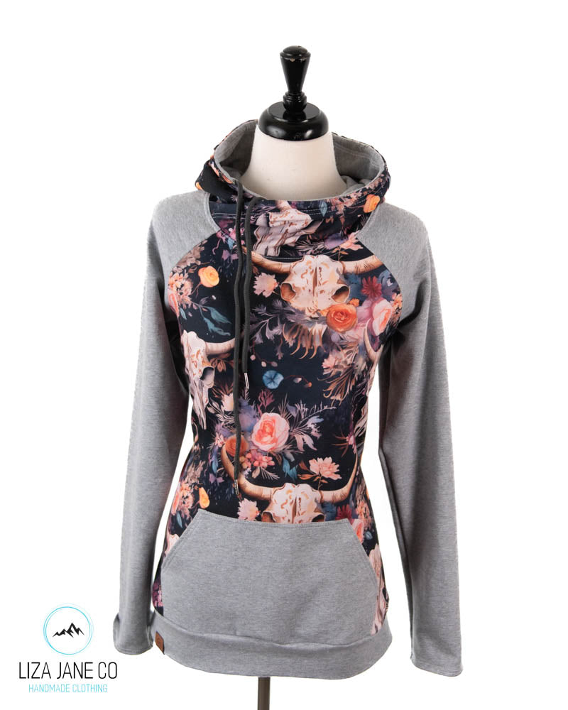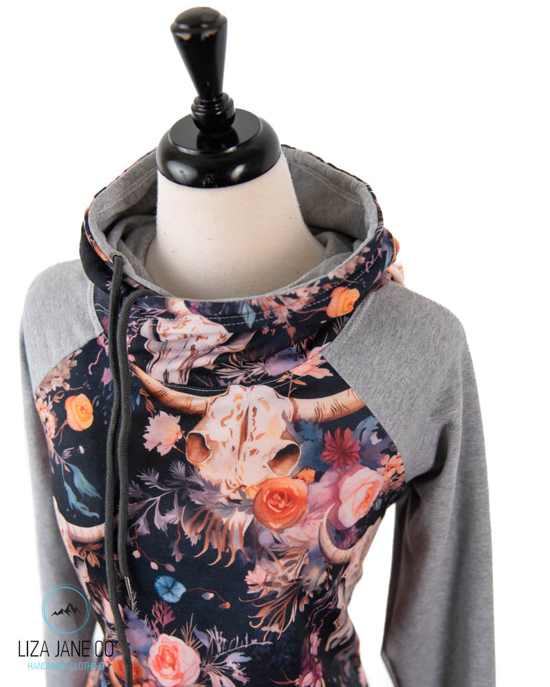 Women's Hoodie | Vibrant Floral skull on Navy and Grey on Sleeves {Made to Order}