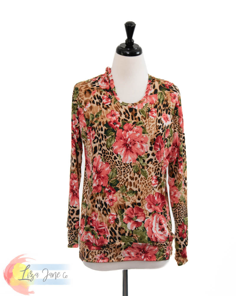 Women's Seaside Hoodie | Red floral & Leopard Print {Small}
